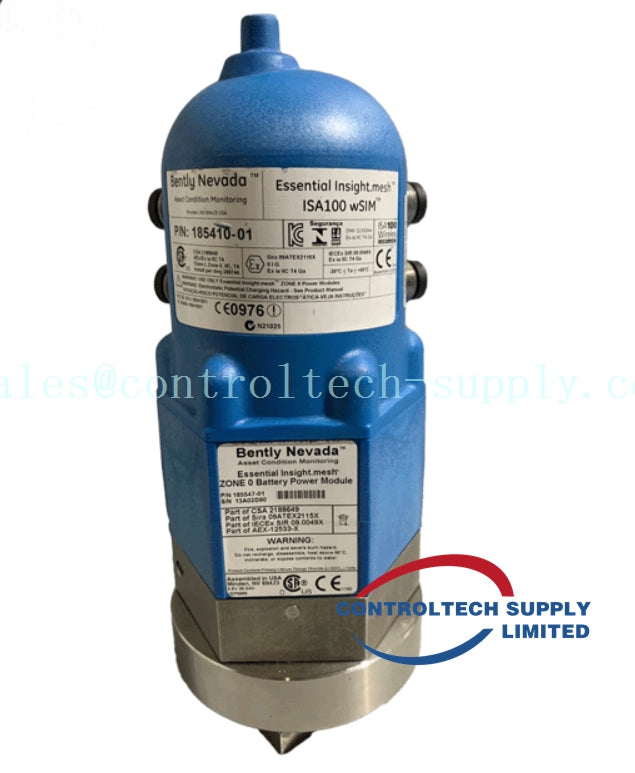 The Bently Nevada 185410‑01 Wireless Sensor Interface Module (wSIM) is a component of the Essential Insight.mesh™ wireless monitoring system. It facilitates the wireless acquisition of vibration and temperature data from industrial machinery, enabling real-time monitoring and diagnostics. This module is designed to operate within ISA100.11a wireless mesh networks, providing a scalable and reliable solution for condition monitoring in various industrial applications.