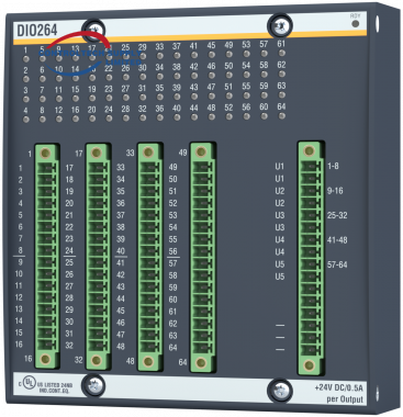 | DIO264 | 00019115-00 | Digital input/output module; 24x DI; 600µs filter; 16x DIO; 24x DO; 24V / 0.5A; 5 groups; 600µs filter; 8 interrupt channel; 50µs delay; isolated |